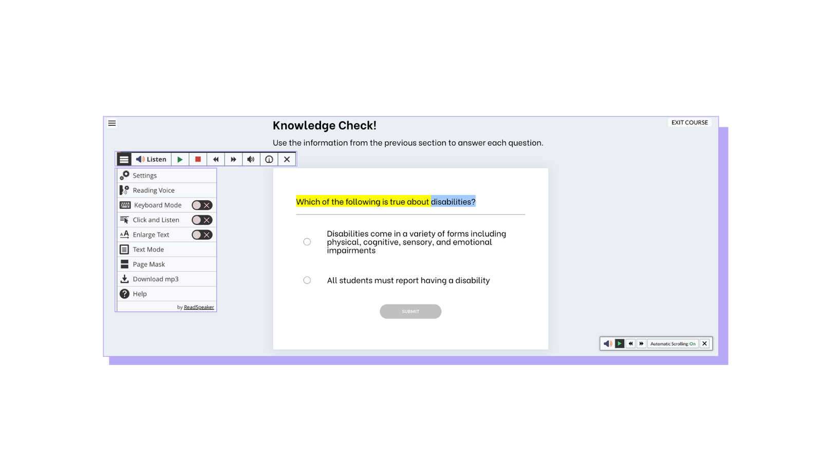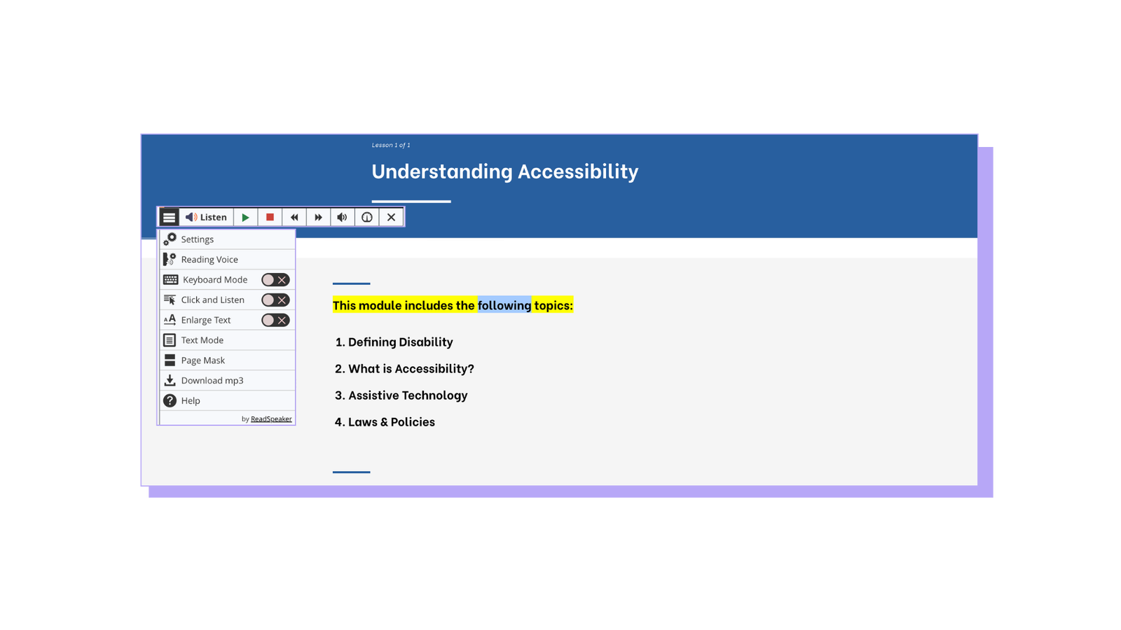 Integrate ReadSpeaker into your courses and give all students the option to listen to their coursework and access literacy tools.