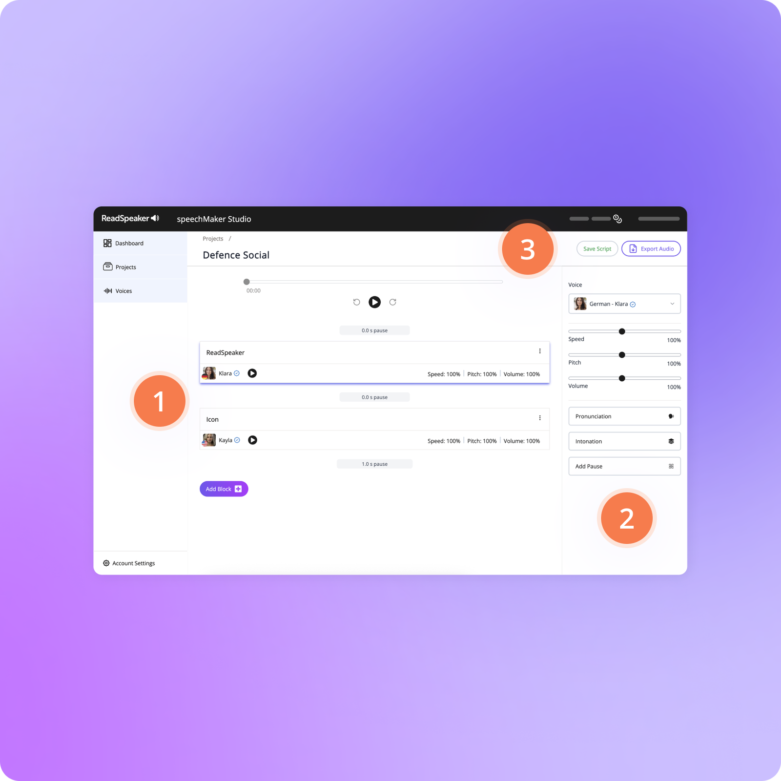 Adjust pronunciation, pacing, pitch, and emphasis with intuitive tools.