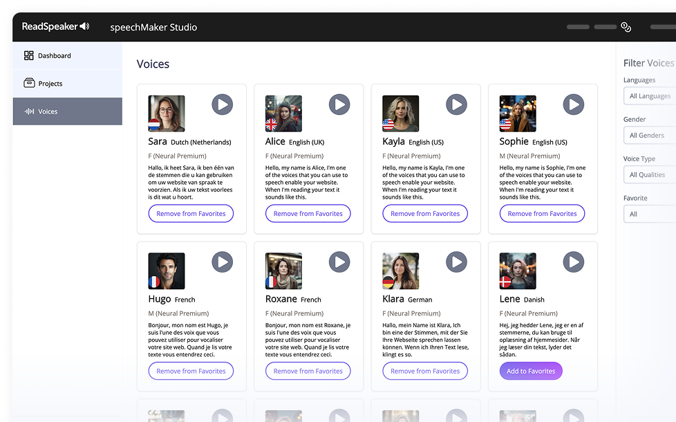 ReadSpeaker speechMaker Studio is a browser-based TTS platform designed for collaborative voice content creation, editing, and management at scale.