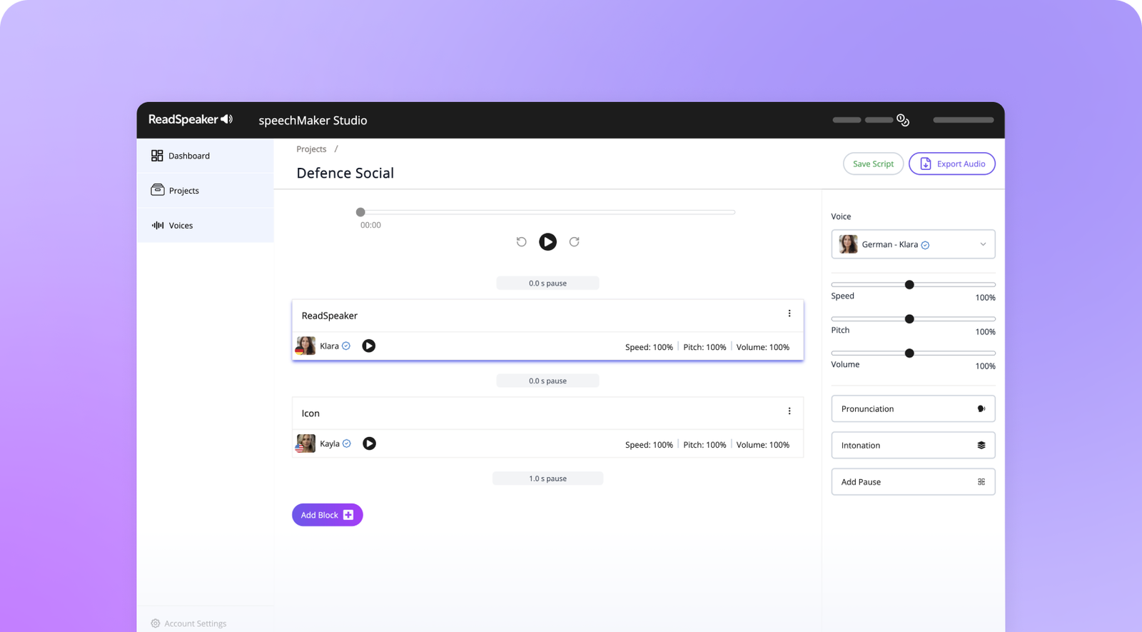 Preview, adjust, and perfect the performance with intuitive controls — from style and pronunciation to intonation and pauses.
